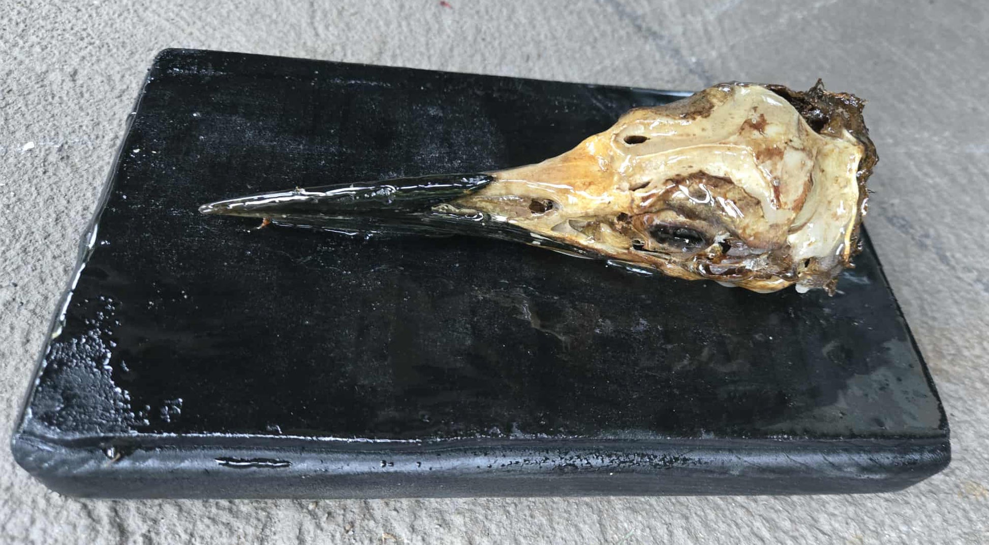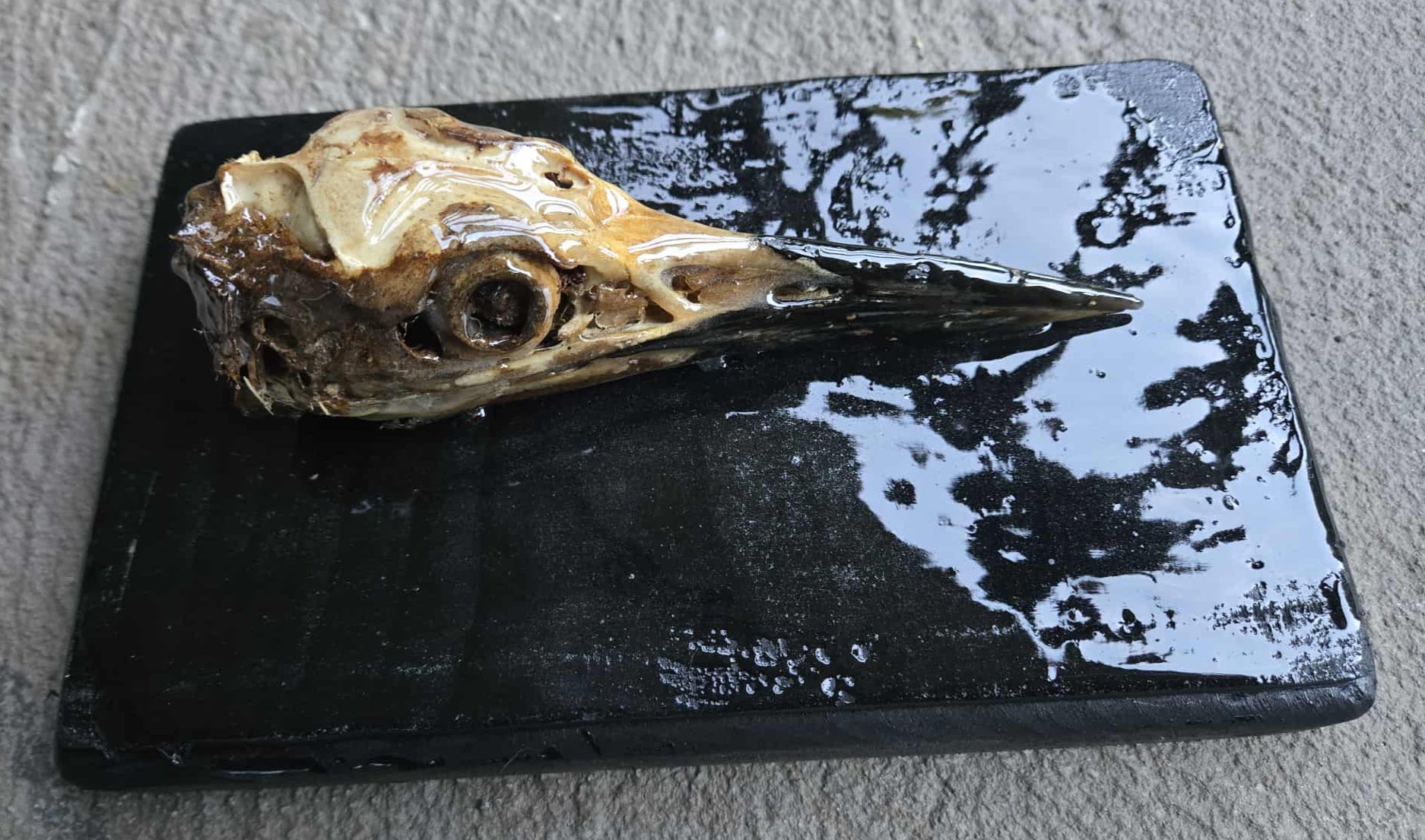 Crâne de héron, traité au formol, enduit d'epoxy et collé sur panneau de bois, prêt à mettre au mur.