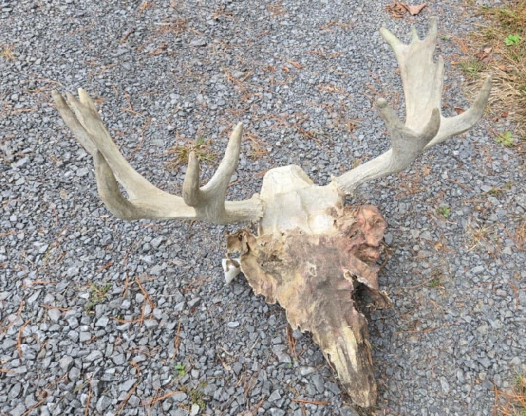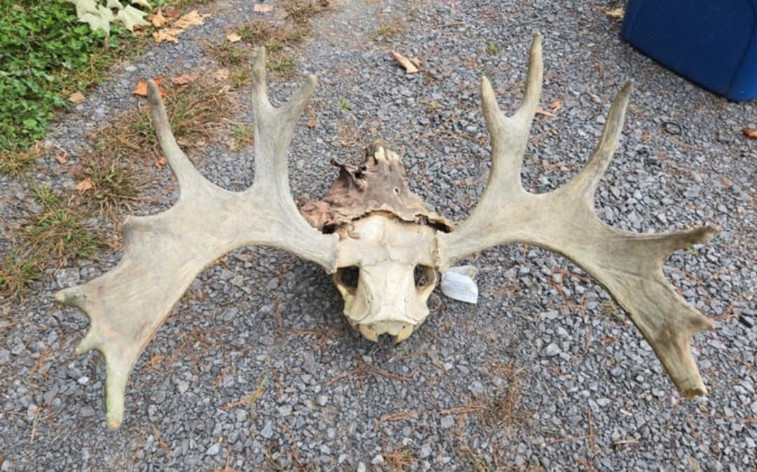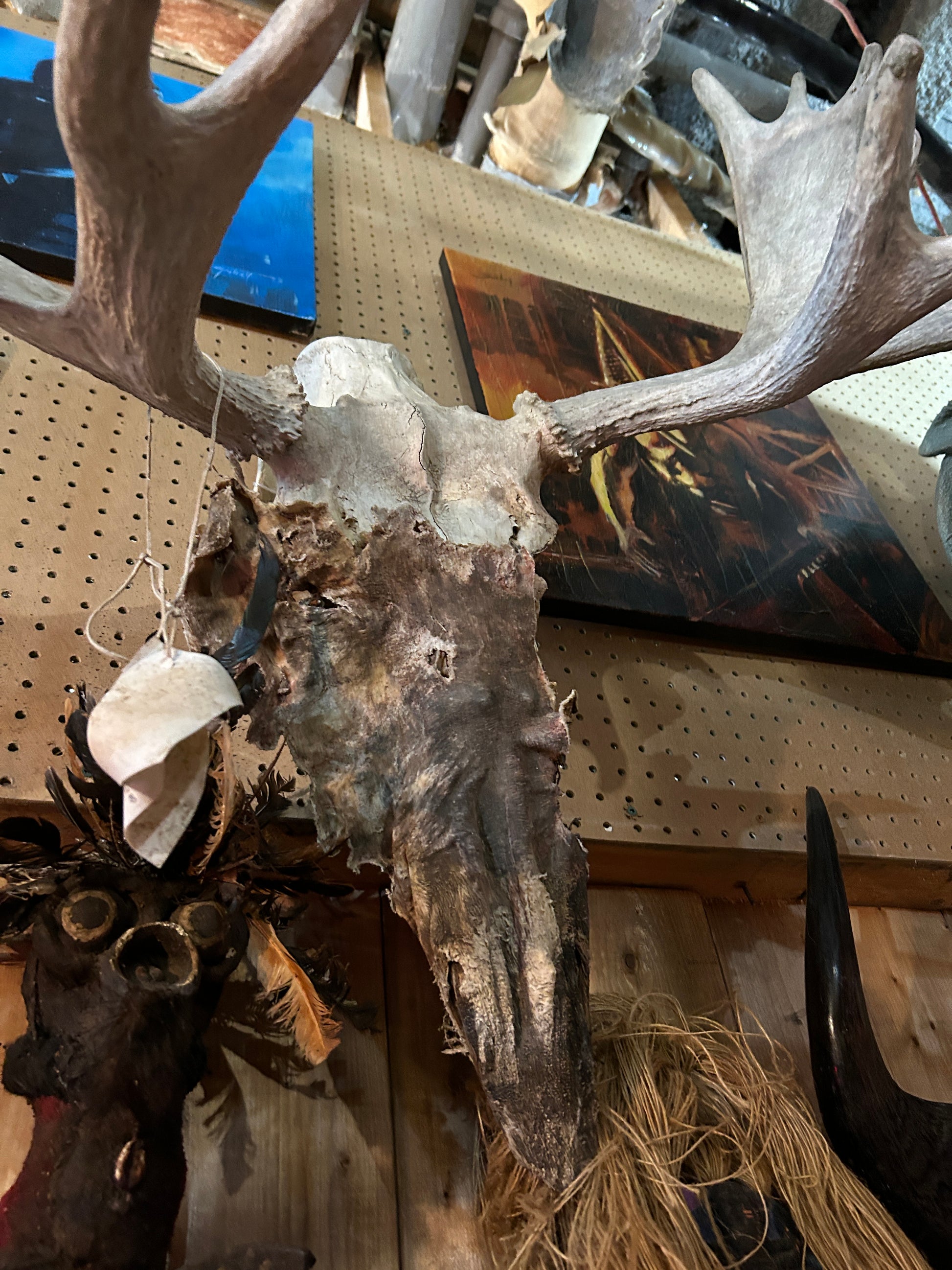 Crâne d'orignal et peau déshydratée.