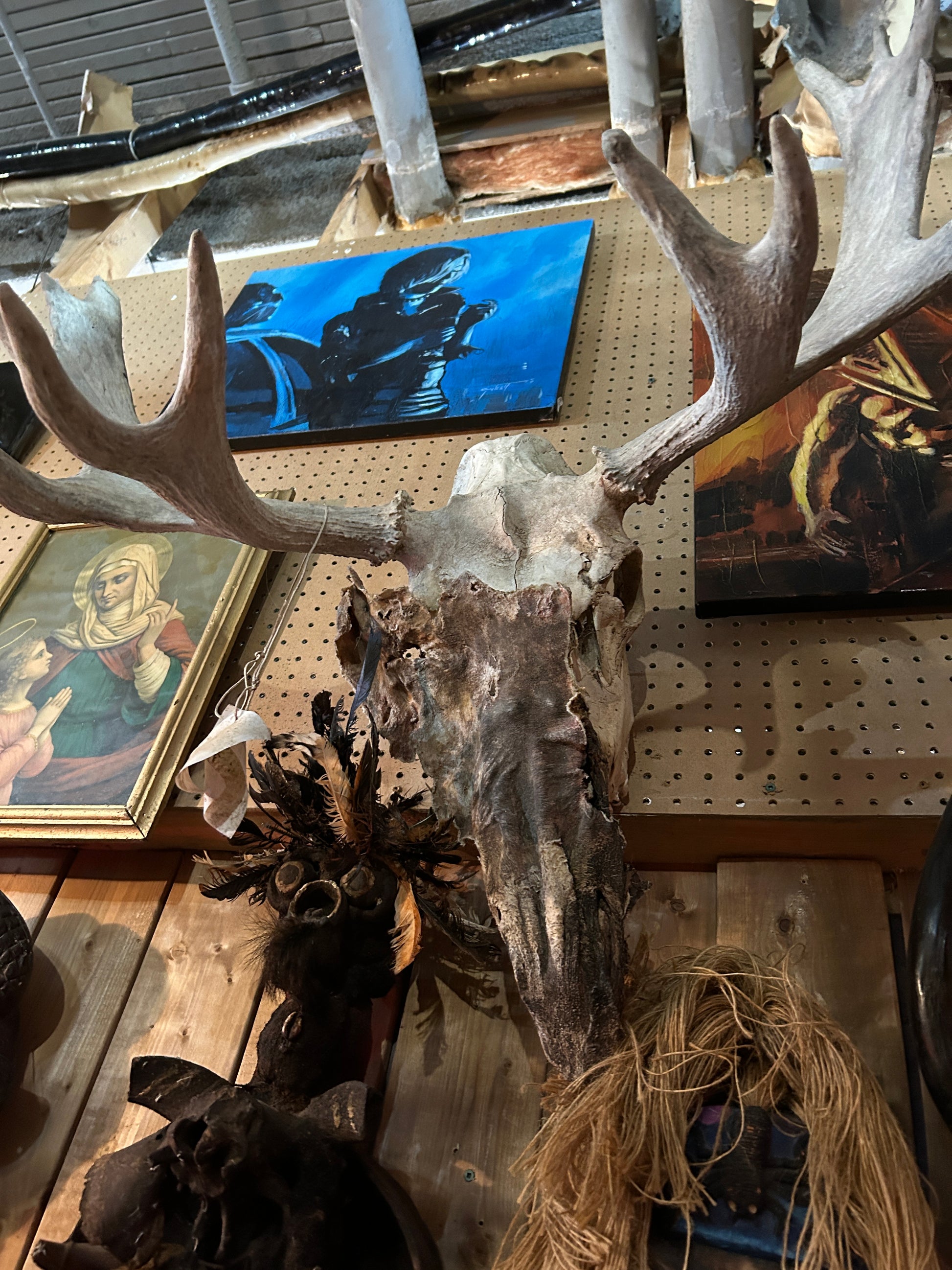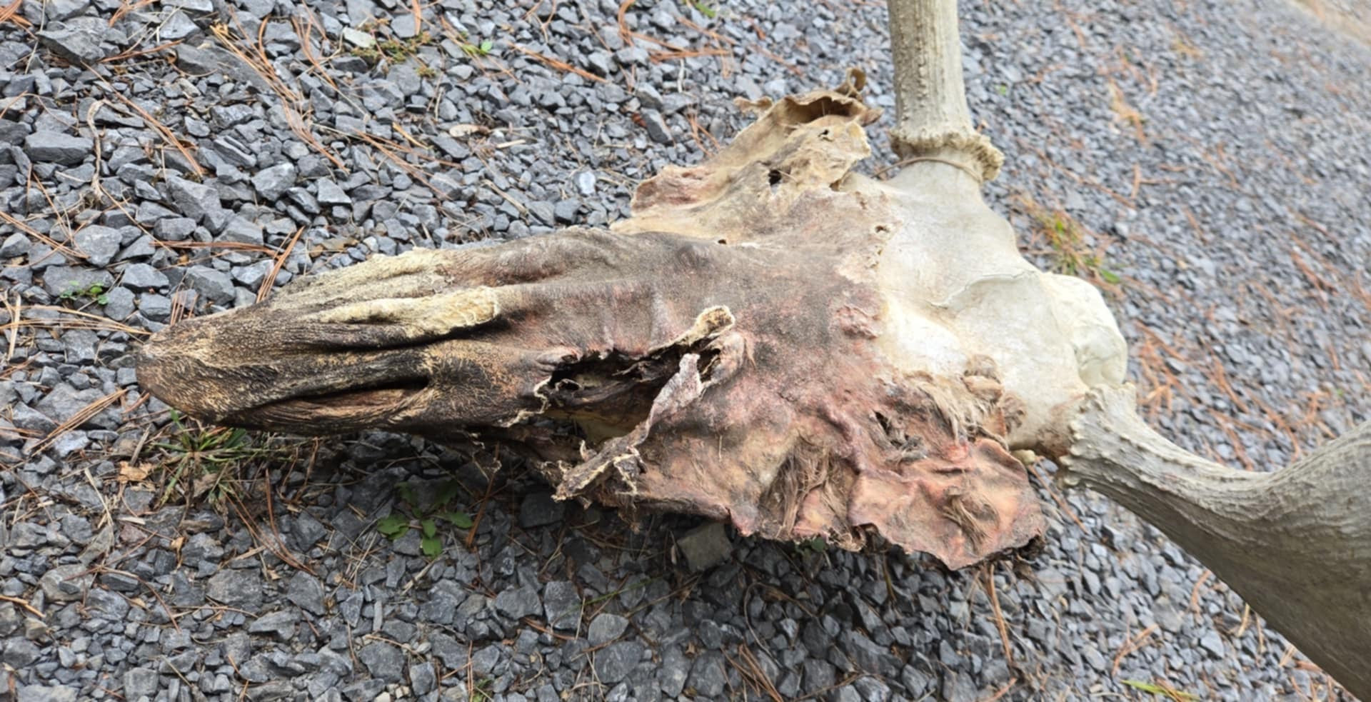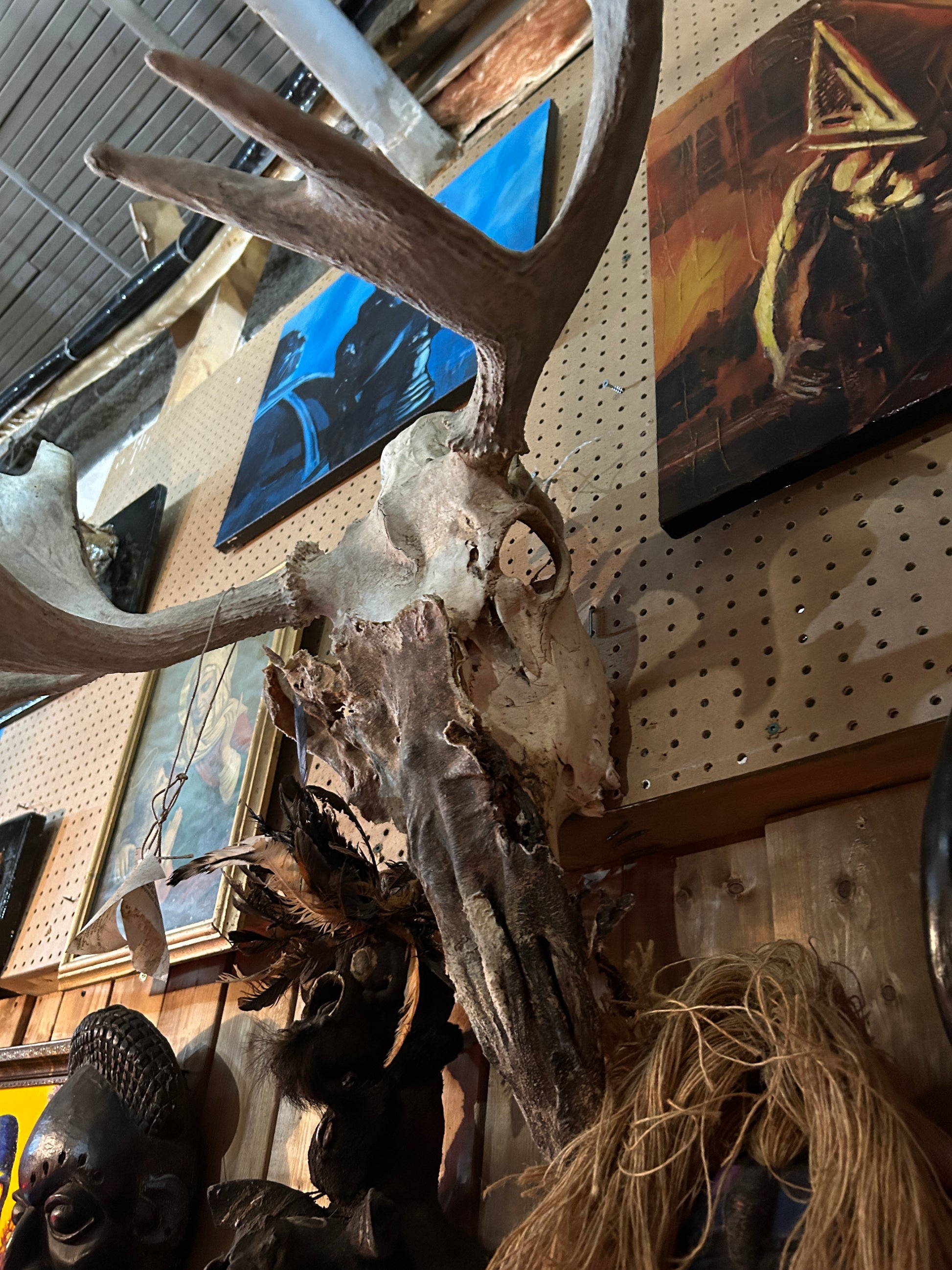 Crâne d'orignal et peau déshydratée.