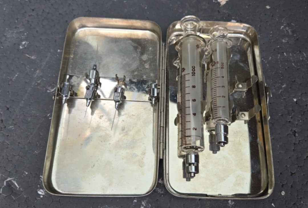 Ensemble de seringues antiques en verre et en métal, avec boîtier en métal.