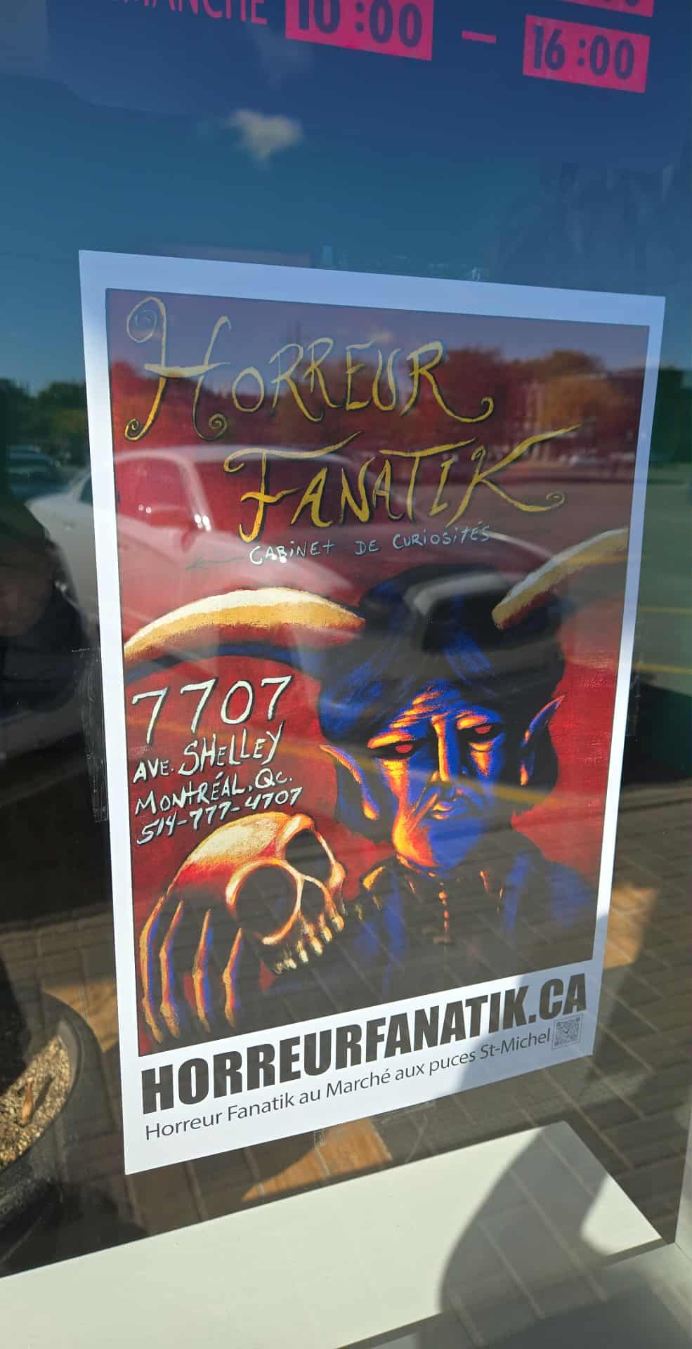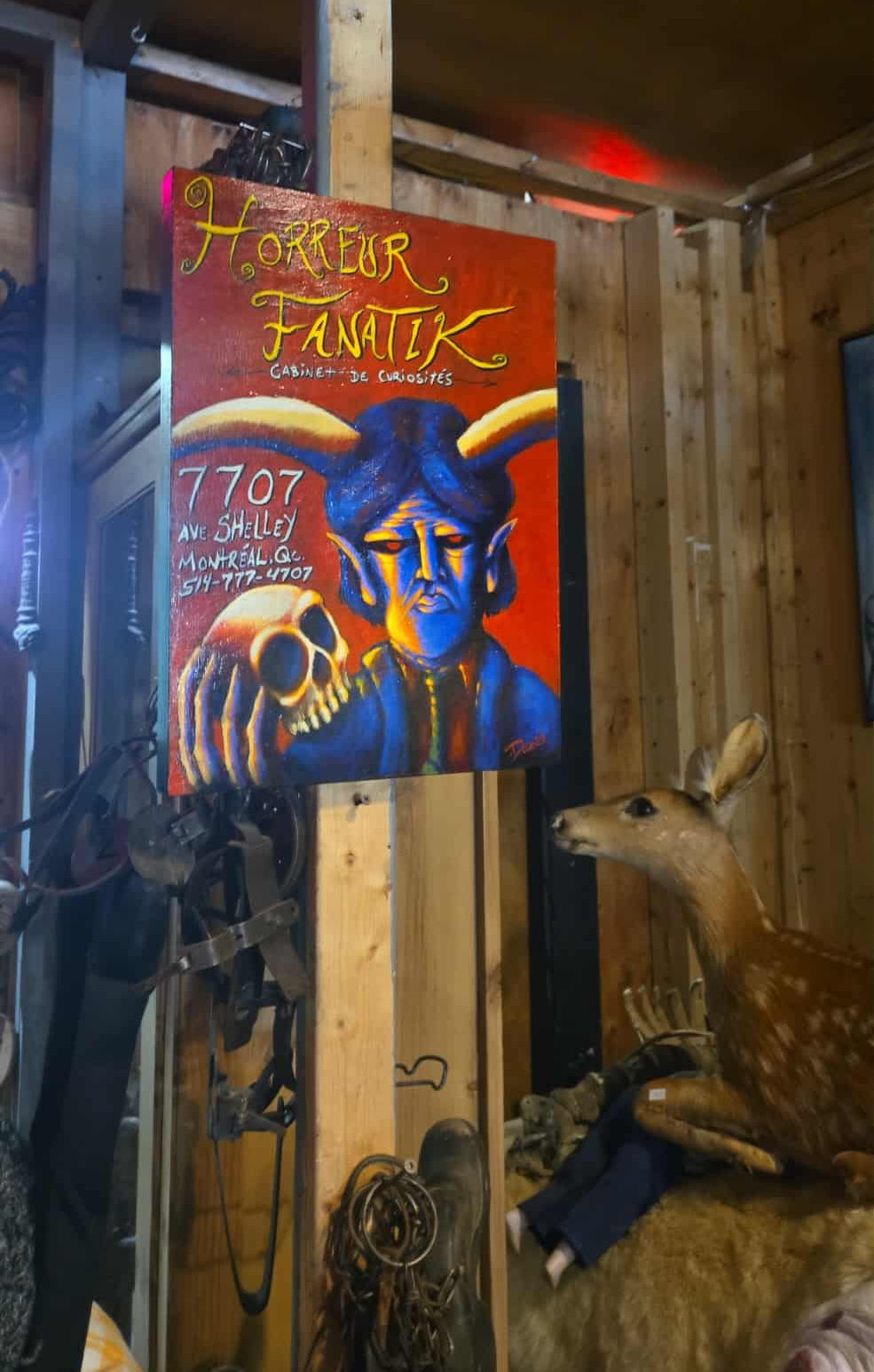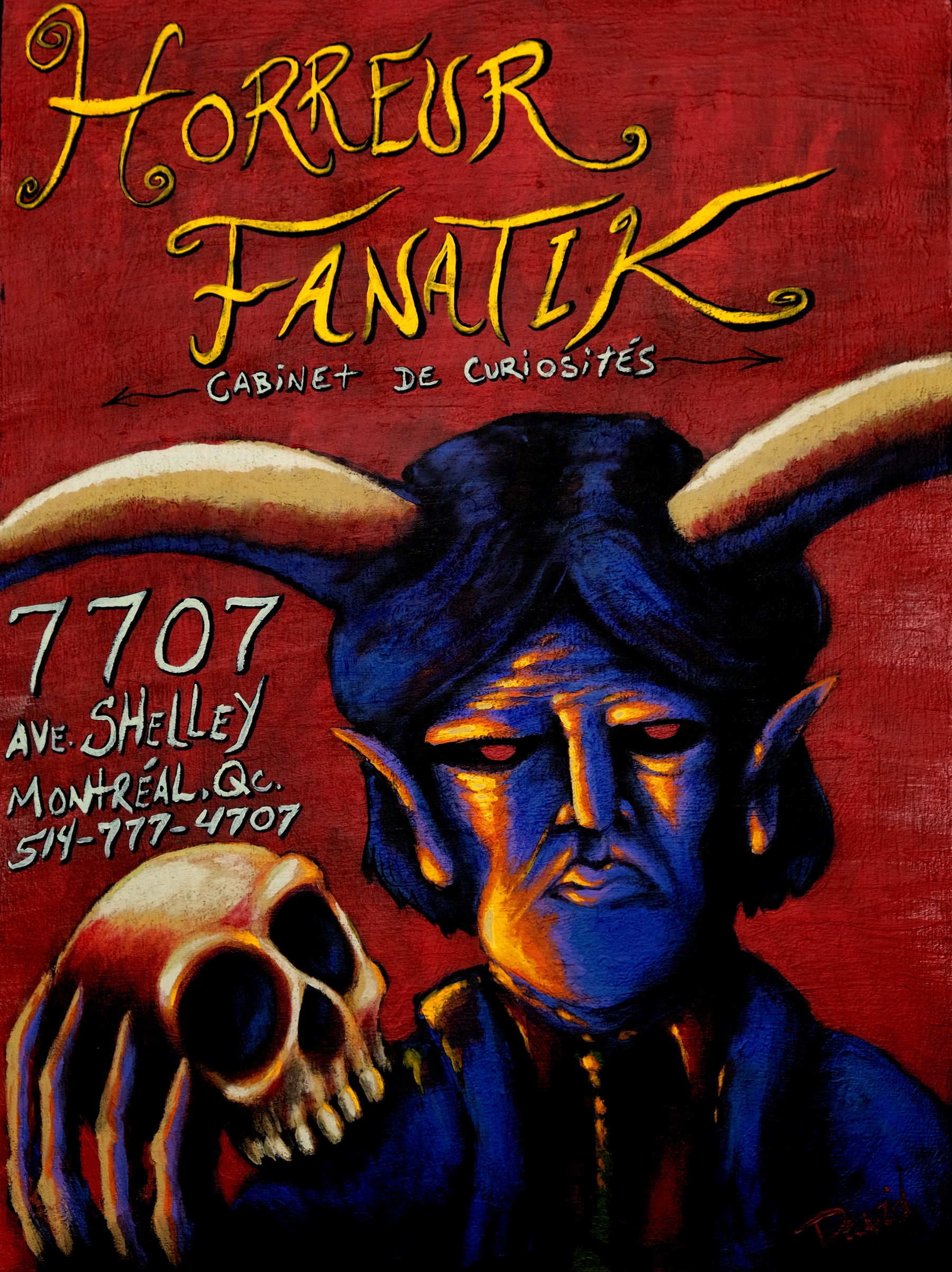 Peinture originale sur panneau de bois 12X16 par David Therrien, ayant servi d'affiche promotionnelle pour le cabinet de curiosités Horreur Fanatik.