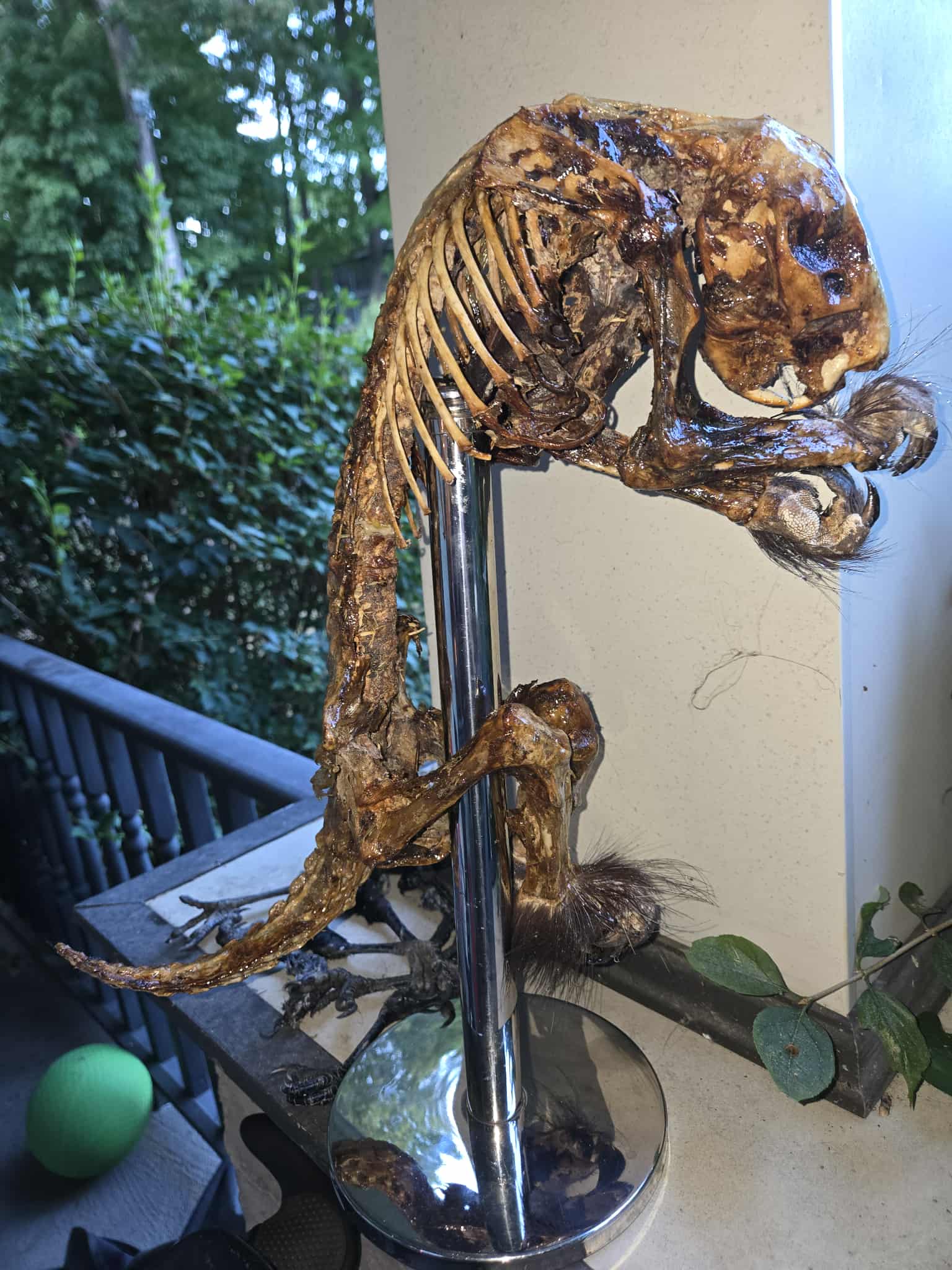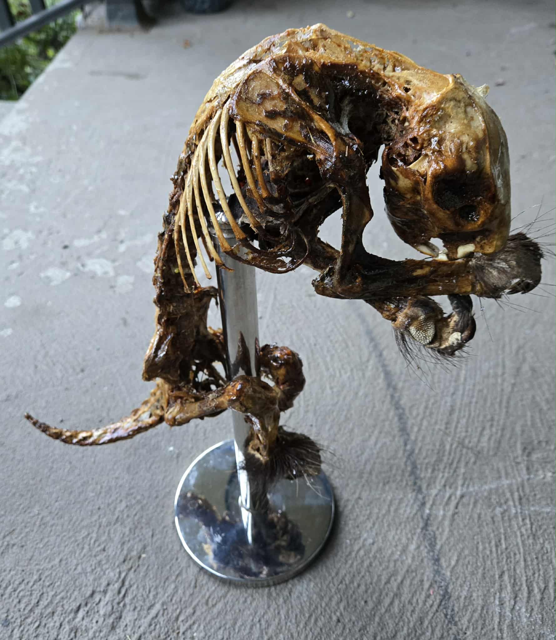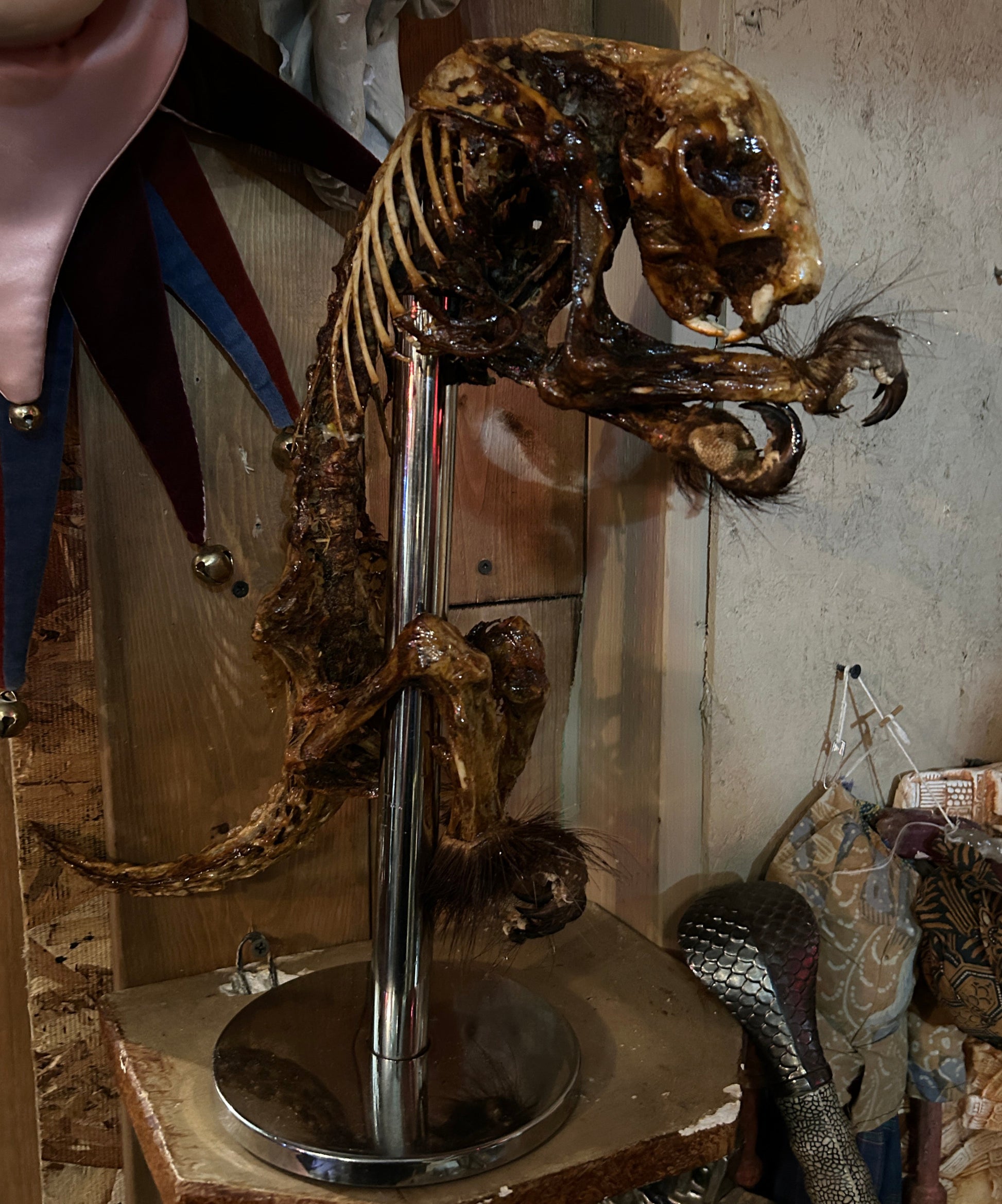 naturalisé et momifié dans le sel, sous le soleil des Laurentides, infusé au formol et enduit d'epoxy. Sur socle de métal.